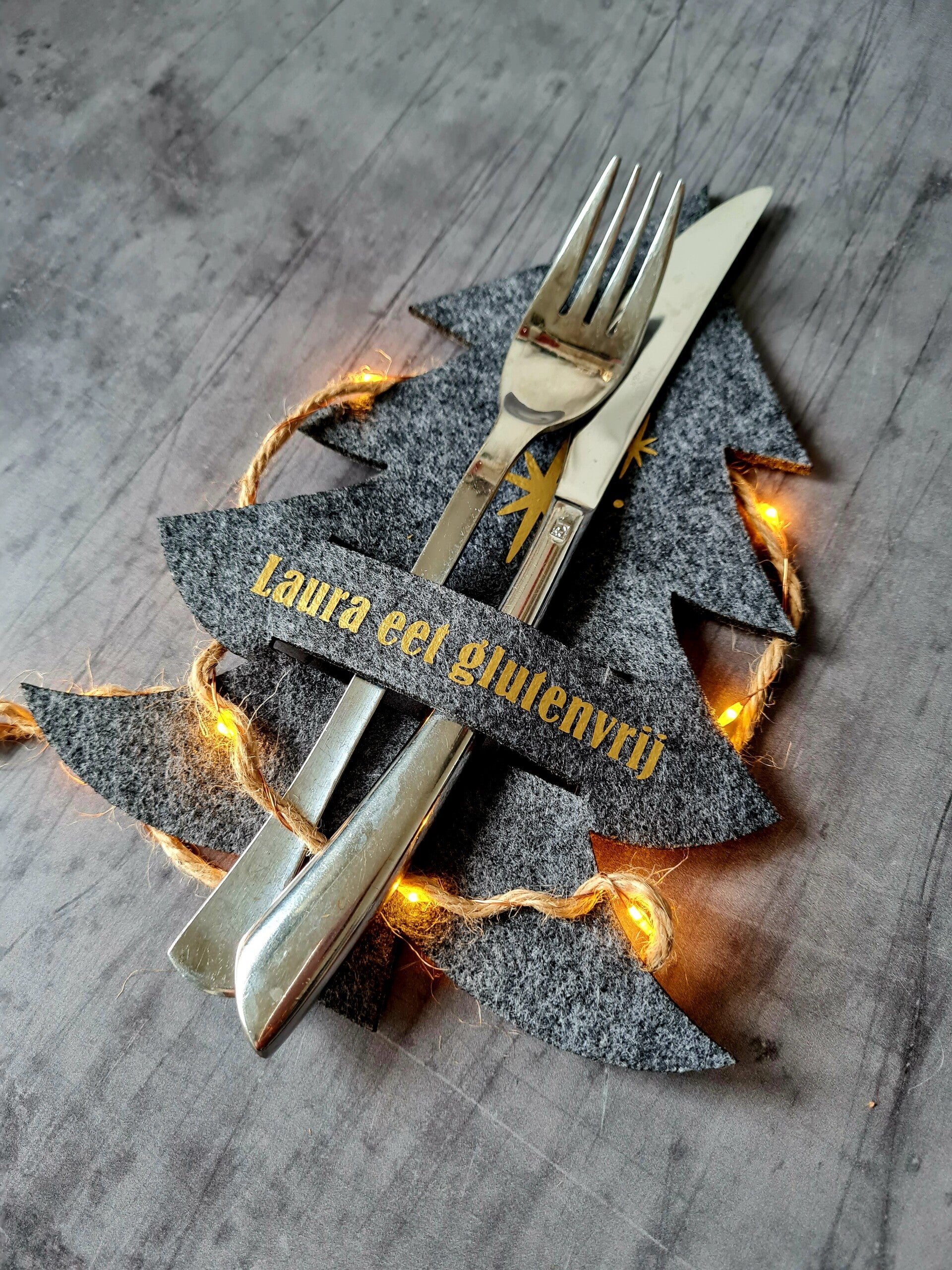 Deze bestekhouder is van vilt en gepersonaliseerd met naam en tekst 'Ik eet glutenvrij'.